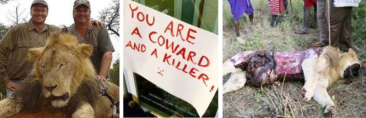 Left: Cecil The Lion And His Killer. Middle: People leave messages at the home of the killer of Cecil. Right: After the photo shoot, the face of the animal victim is grotesquely cut off, just as it’s skin. Trophies for back home to hang at your wall and brag about how you killed a “dangerous animal”.Cecil The Lion.